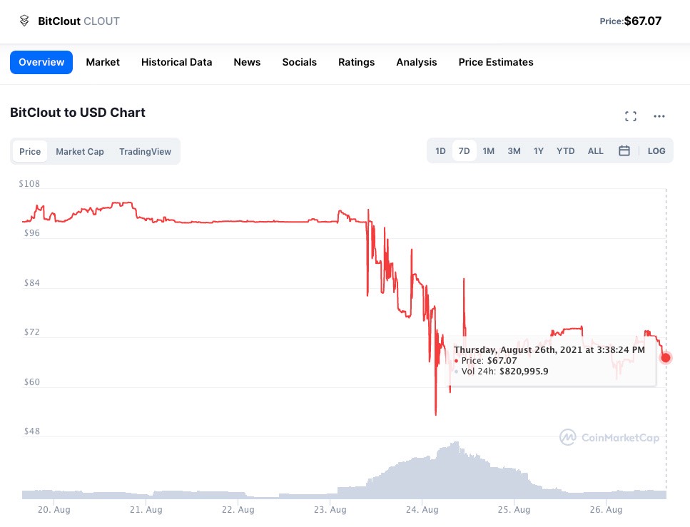 Após um mês de estabilidade em US $ 100, o Clout caiu drasticamente. Gráfico: CoinMarketCap.