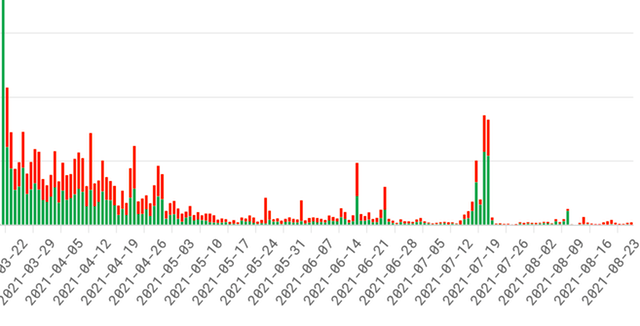 Entre 10 e 23 de agosto, o volume de vendas de tokens de criadores foi mais de 3 vezes o volume de compras: $ 4,5 milhões em vendas contra $ 1,4 milhão em compras.