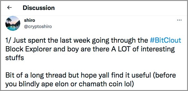 Infelizmente, como sua atitude era muito antagônica em relação ao chefão do Bitclout, e o objetivo de Shiro era provar que o Bitclout era um golpe (o que não é o caso deste artigo), esta informação não recebeu nenhum feedback no Bitclout e permaneceu mais ou menos “confidencial” no Twitter.
